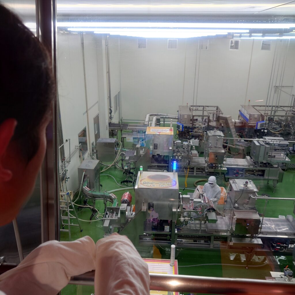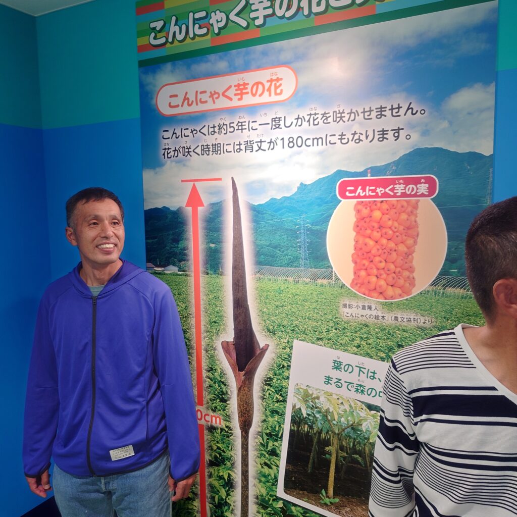 工場の見学では写真に写るこんにゃく芋の花と自身の背丈を比べたり、いろいろ味付けされたこんにゃくを試食して美味しく体験しました。