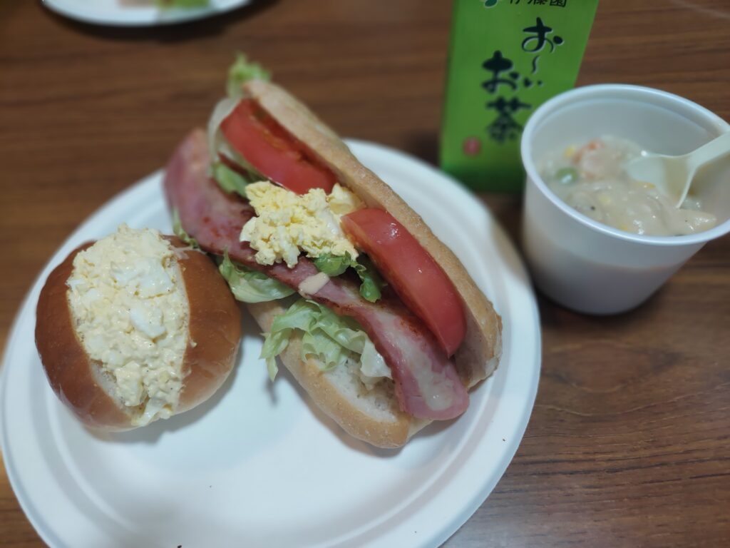 朝ごはんは、BLTサンド・タマゴロール・クラムチャウダーです。
